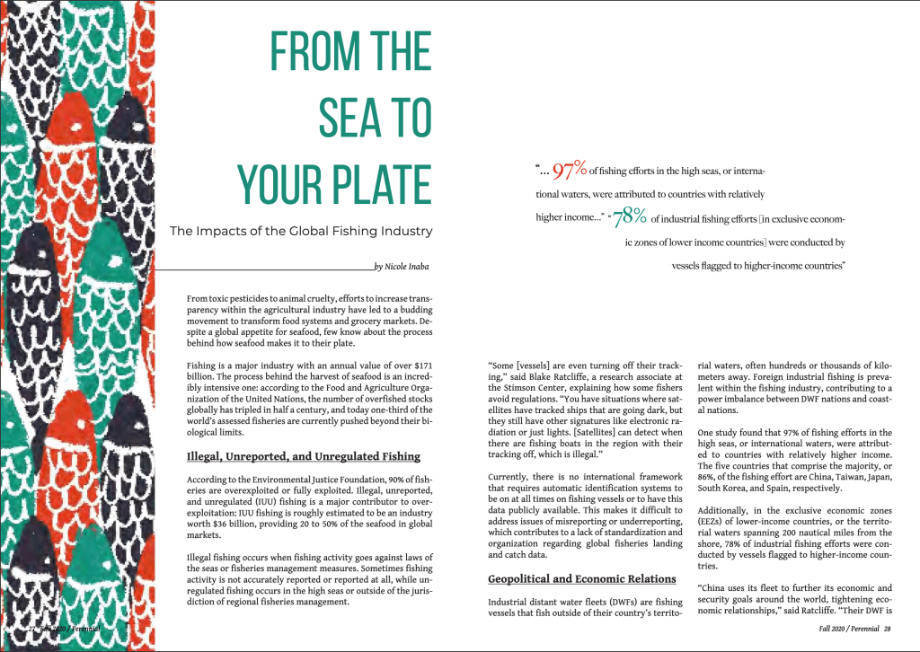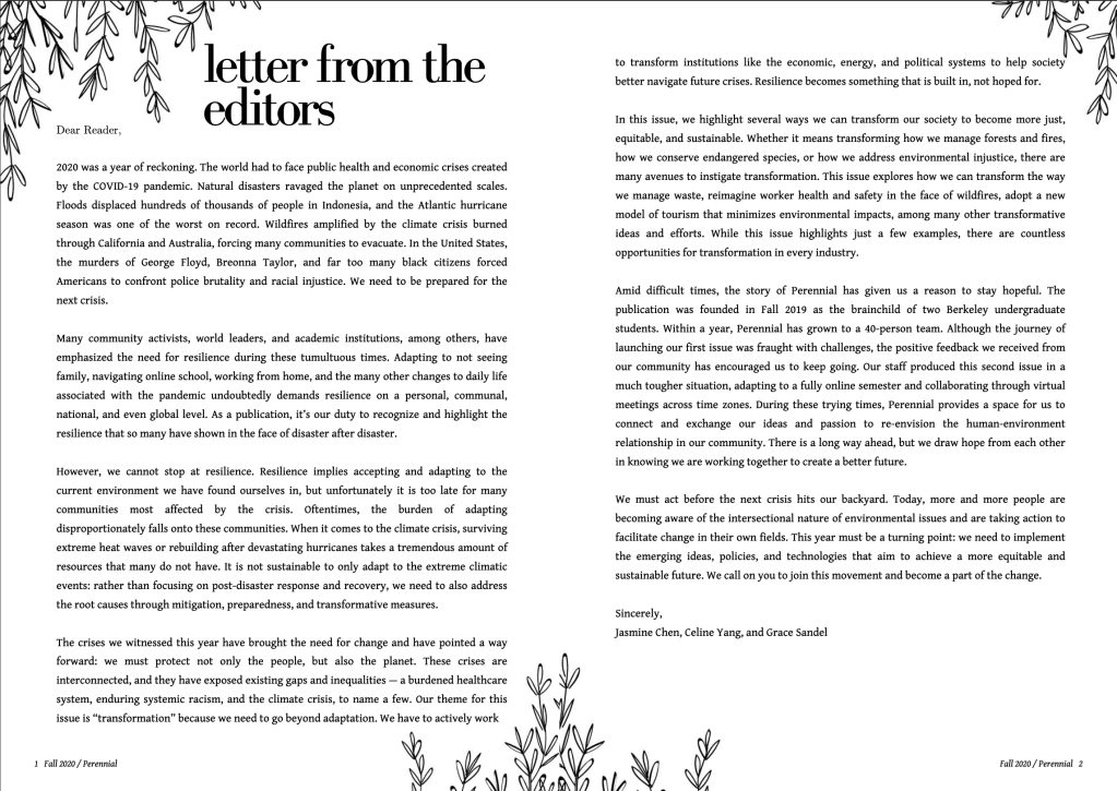 As editor-in-chief, I led Perennial’s mission to educate and increase awareness on the intersectional nature of the climate crisis. Despite being a new and budding organization, I managed and grew our publication for 2 years. Under my leadership, we published 3 issues (shown above) that highlight emerging ideas, policies, and technologies across various industries that aim to drive a more equitable and sustainable future. With our publication, we seek to activate change and action among the UC Berkeley campus community and beyond.