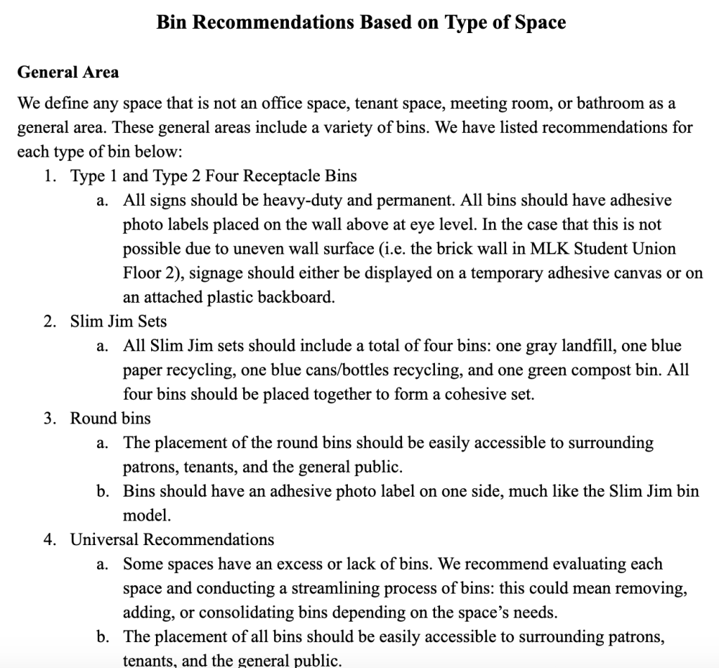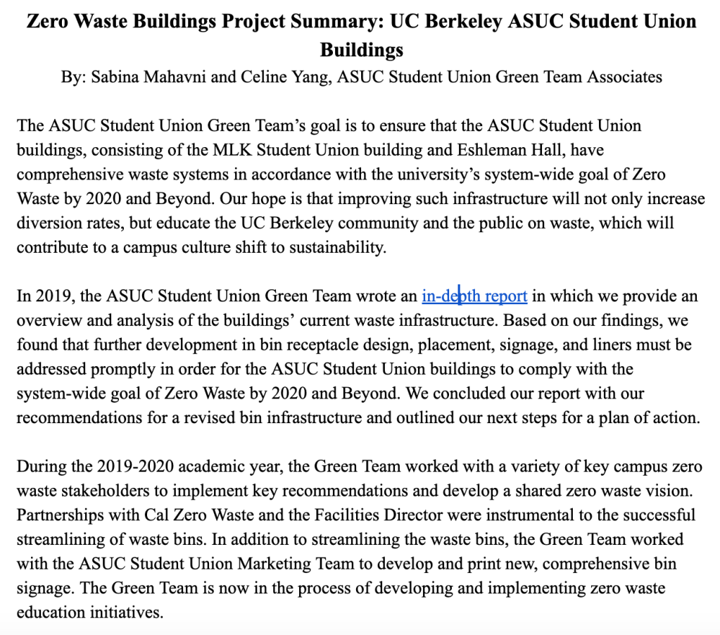 As SERC’s Green Team Associate, I led the Zero Waste Buildings Project to reduce campus waste, increase diversion rates, and educate the UC Berkeley community and the public on waste. To start out, I co-wrote an in-depth report analyzing campus waste infrastructure and outlining recommendations for improvement. Following the report release, I coordinated across operations, marketing, and administration departments to implement zero waste bin rollout and streamline waste management practices. To supplement our infrastructural work, I also managed a team of 10+ students to implement campus waste education and sustainability engagement initiatives.
