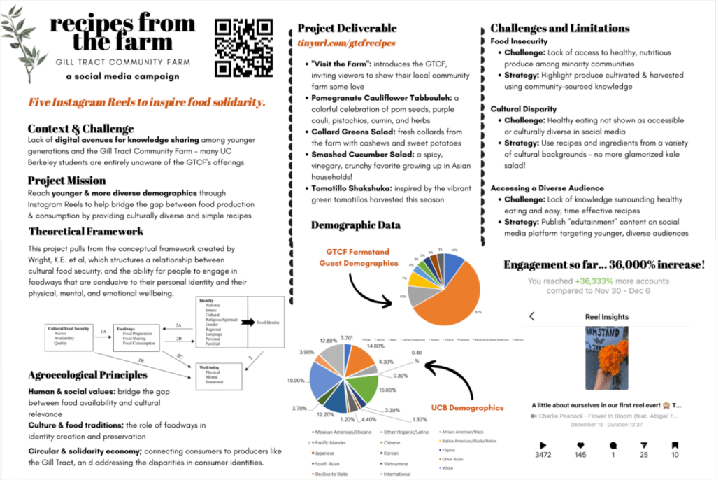 I worked within a 4-member team to design and execute the “Recipes from the Farm” social media campaign. We produced short, “edutainment” Tiktok-style content to highlight how people can turn UC Berkeley Gill Tract farm produce into healthy, easy, affordable, and culturally diverse dishes. Our mission was to expand and diversify the perception of “healthy eating” on social media. We conducted research and recipe development to highlight recipes from diverse cultures. As a result of our campaign, the Gill Tract’s Instagram account, which previously did not have any Reels, reached 36,000% new Instagram accounts in one week.