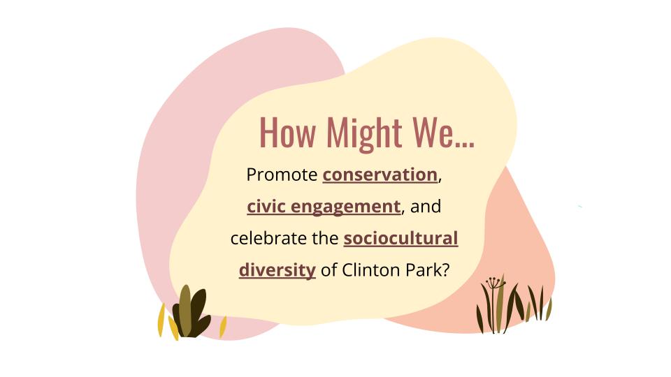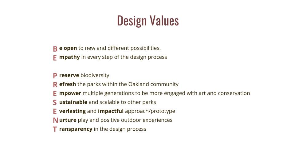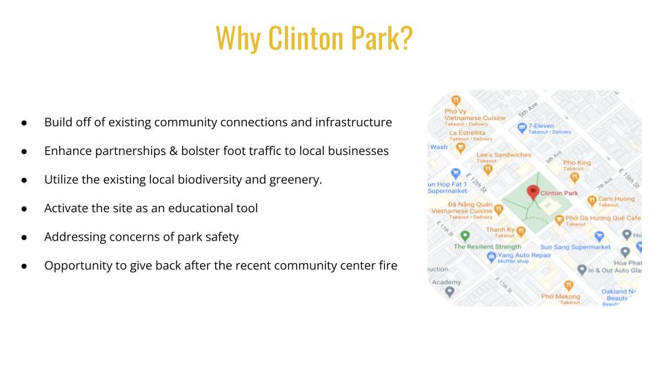 Oakland-based nonprofit Civic Design Studio (CDS) requested my team to envision and design a public park proposal to promote conservation, civic engagement, and celebrate Oakland’s sociocultural diversity. CDS’s director wanted us to lean on our diverse backgrounds, think outside of the box, and incorporate technology to help envision a green space that includes and serves everyone in the community.