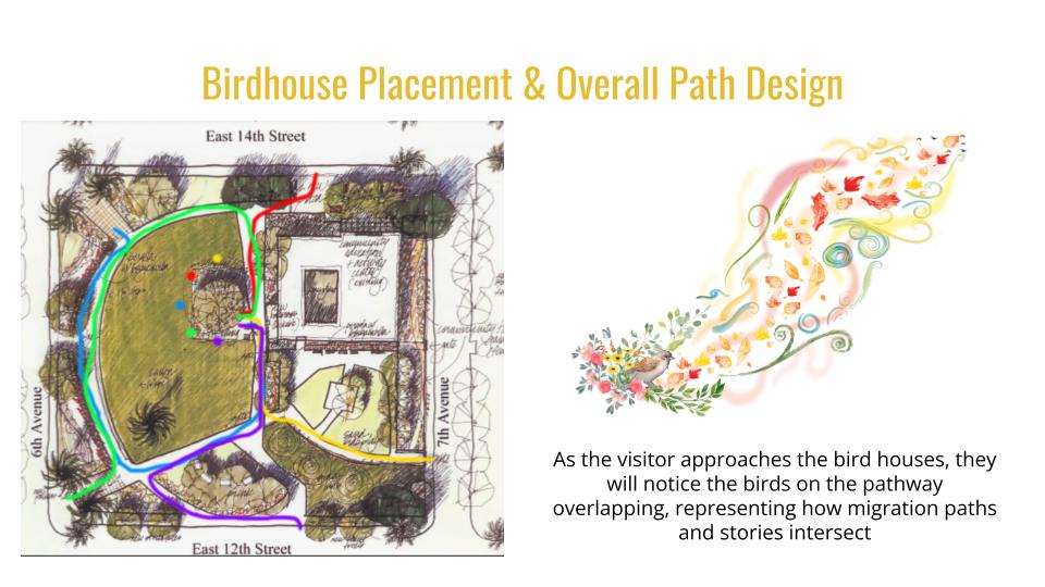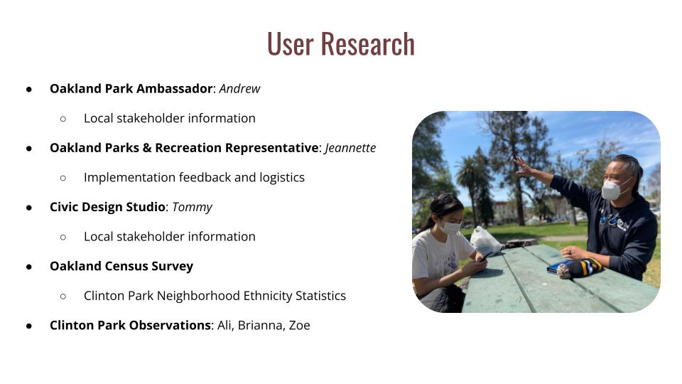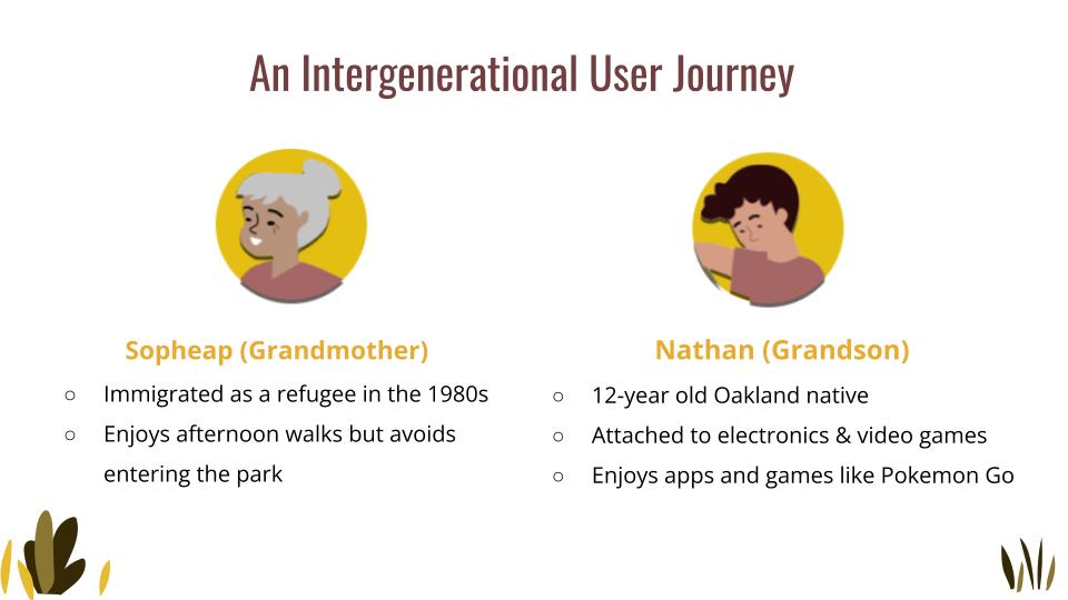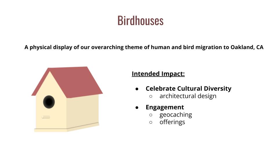 We interviewed park-goers, community leaders, and nonprofit directors; conducted research on best practices for urban green spaces; and ideated ways to engage users of all ages and backgrounds. To better recognize and serve Oakland’s multicultural communities, we designed all project content to be multicultural and/or multilingual. This ranged from designing park birdhouses based on Southeast Asian cultures to using geocaches as a platform to share community migration stories.