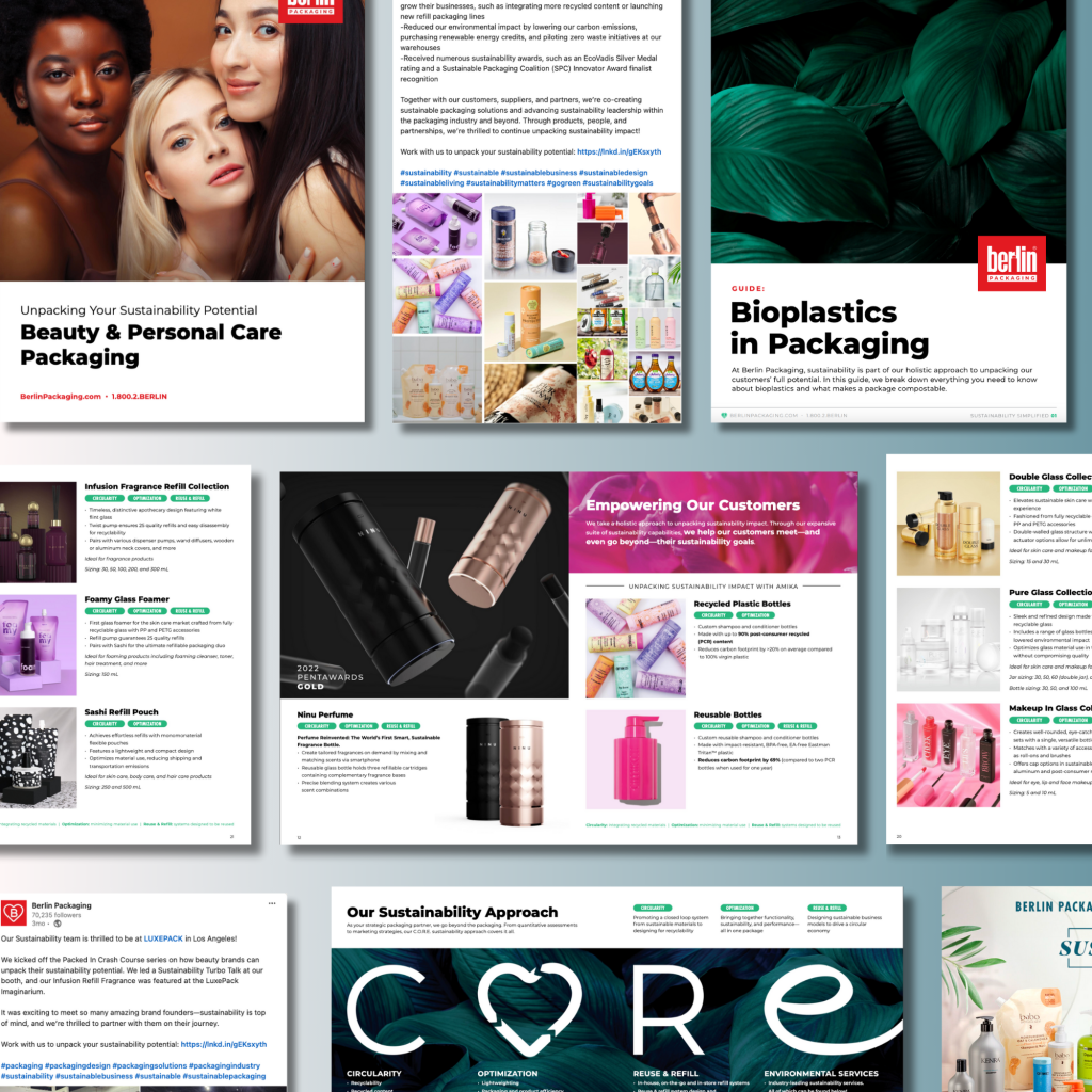 I spearheaded a new sustainability content strategy for a $3B packaging company. I created core brand themes on “Going Beyond the Packaging” and “Unpacking Sustainability Impact,” reinforcing these key value propositions across all sustainability marketing assets.